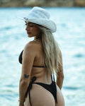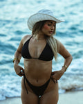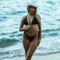 Dive into summer fun with this sleek black two-piece swimsuit. The bottom features adjustable side ties, allowing you to customize the fit to your liking for all-day comfort. Perfect for sunny days by the water or beachside adventures, this set blends style and practicality so you can shine with confidence wherever you go.